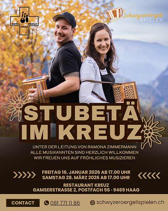 Musikstubetä im Restaurant Kreuz unter der Leitung von Ramona Zimmermann. Alle Musikantinnen und Musikanten sind herzlich Willkommen. Wir freuen uns auf fröhliches Musizieren.